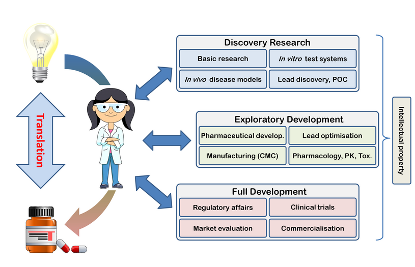 By taking part in the advanced research programmes of the transMed partners, supported by an extensive training module, transMed PhD students will obtain an outstanding competence portfolio. This encompasses basic research into disease mechanisms and target definition, drug design and development, in vitro test systems and in vivo disease models, drug delivery systems (DDS), good manufacturing practice (GMP) production, toxicological testing and pharmacokinetics, regulatory affairs and good clinical practice (GCP), patenting and other intellectual property (IP)-issues, all the way to clinical trials and commercialisation.