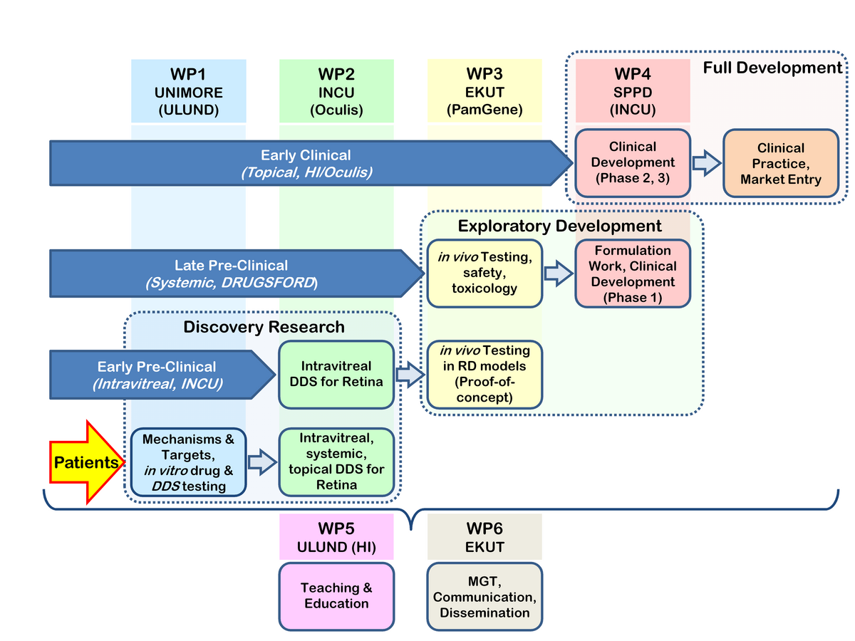 To address these challenges, transMed uses a stair-wise approach as shown in Figure 2: Specifically, the INCU DDS, which is in early pre-clinical development, is very innovative and has promising physicochemical properties for intravitreal drug application. The compounds and DDS for systemic delivery developed in the DRUGSFORD project are already in the final stages of pre-clinical development, and may enter phase 1/2 trials during the transMed project. Finally, the DDS pioneered by HI and Oculis for topical delivery to the retina is now in phase 1 clinical trials and may move forward to Phase 2 within the next four years. Thus, already from this parallel line-up of partners and projects, the ESRs will get a broad overview of translational research. transMed focuses in particular on the critical transition from pre-clinical to clinical development (i.e. exploratory development), such as pre-clinical animal studies and regulatory aspects including GCP in phase 1-3 clinical studies (SPPD, Oculis, HCTC).